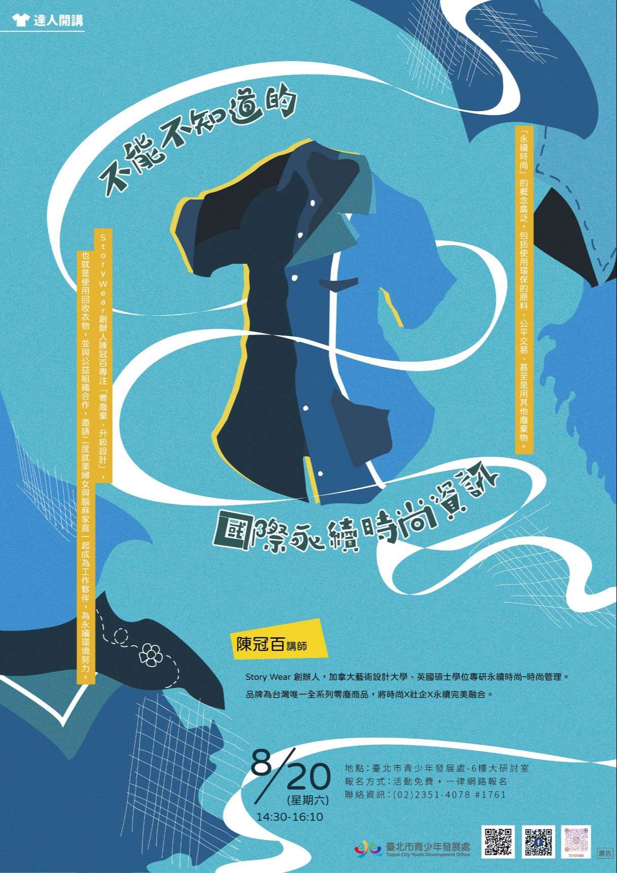 一、經由講師職涯經驗分享,讓年輕學子認識各行各業,藉以 了解自身興趣及性向,進而找到未來的道路與建立自我價 值;Story Wear 創辦人陳冠百老師分享她踏上永續時尚零 廢棄的心路歷程與過程。 二、活動說明如下: (一)參加對象:青少年學子及一般民眾。 (二)活動時間:111年8月20日(星期六)下午2時30分至4時 10分。 (三)報名方式:網路報名(https://reurl.cc/VDdnRZ)。 (四)報名費用:免費。(五)活動地點:臺北市青少年發展處6樓大研討室(臺北市中 正區仁愛路1段17號)。 三、宣傳稿內容如下: (一)90字:臺北市青少年發展處8月20日14:30舉辦達人開講 「不能不知道的國際永續時尚資訊」,Story Wear 創辦 人陳冠百老師與您分享她踏上永續時尚零廢棄的心路歷 程,以及過程中的挑戰。活動免費,詳見青發處官網。 (二)60字:臺北市青少年發展處8月20日14:30舉辦達人開 講:不能不知道的國際永續時尚資訊。陳冠百與您分享 她踏上續時尚零廢棄的心路歷程;活動免費詳見青發處 官網。 (三)30字:青發處8/20陳冠百開講:不能不知道的國際永續 時尚資訊。活動免費詳官網。 四、若對本活動有任何問題,請洽聯絡窗口:02-23514078轉 1761,莊先生。 五、檢附活動海報及Banner電子檔各1份,如需紙本海報請連繫 承辦人。