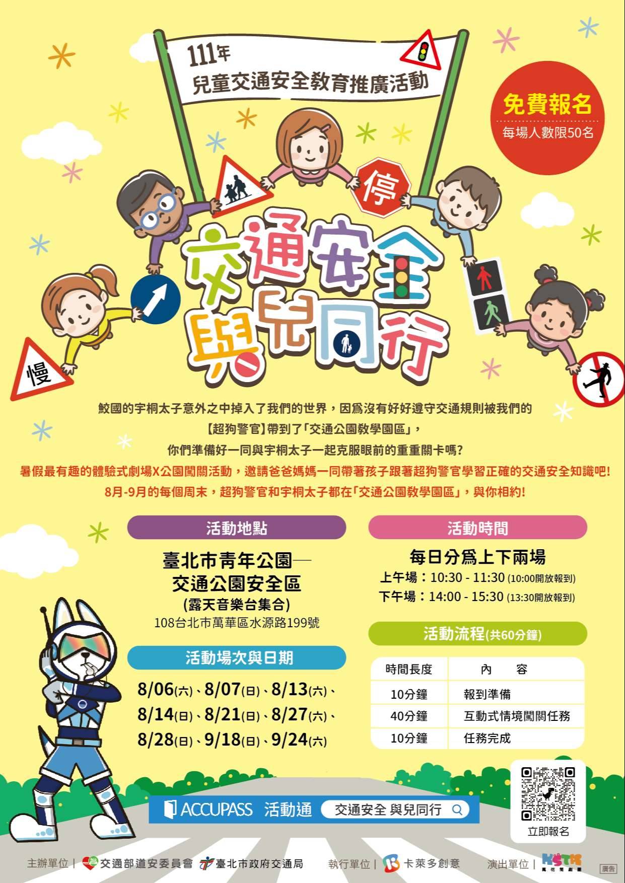 一、依據本府交通局111年7月25日北市交安字第1113036635號 函辦理。 二、為了推廣兒童交通安全教育,透過辦理交通安全校園推廣 活動及交通公園闖關活動等,讓兒童能學會如何正確穿越 路口,避開視野死角區,從中學習自我保護的能力,降低 交通事故發生機率。本府交通局於111年8月6日起至9月24 日舉辦「111年兒童交通安全教育推廣活動」,共計17場次 親子闖關活動,地點位於交通公園,相關活動簡介及報名 資訊等詳如附件。 三、請貴校踴躍報名,場次有限,額滿為止(相關活動或報名 資訊可洽詢卡萊多創意有限公司:簡小姐,電話:(02)2222-2602 /官方 Line@ID:@ksac)