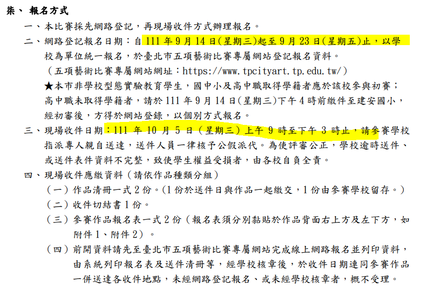 (二)網路登記報名及列印報名表時間:自111年9月14日(星 期三)上午9時起至111年9月23日(星期五)止,以學校為單位統一報名。