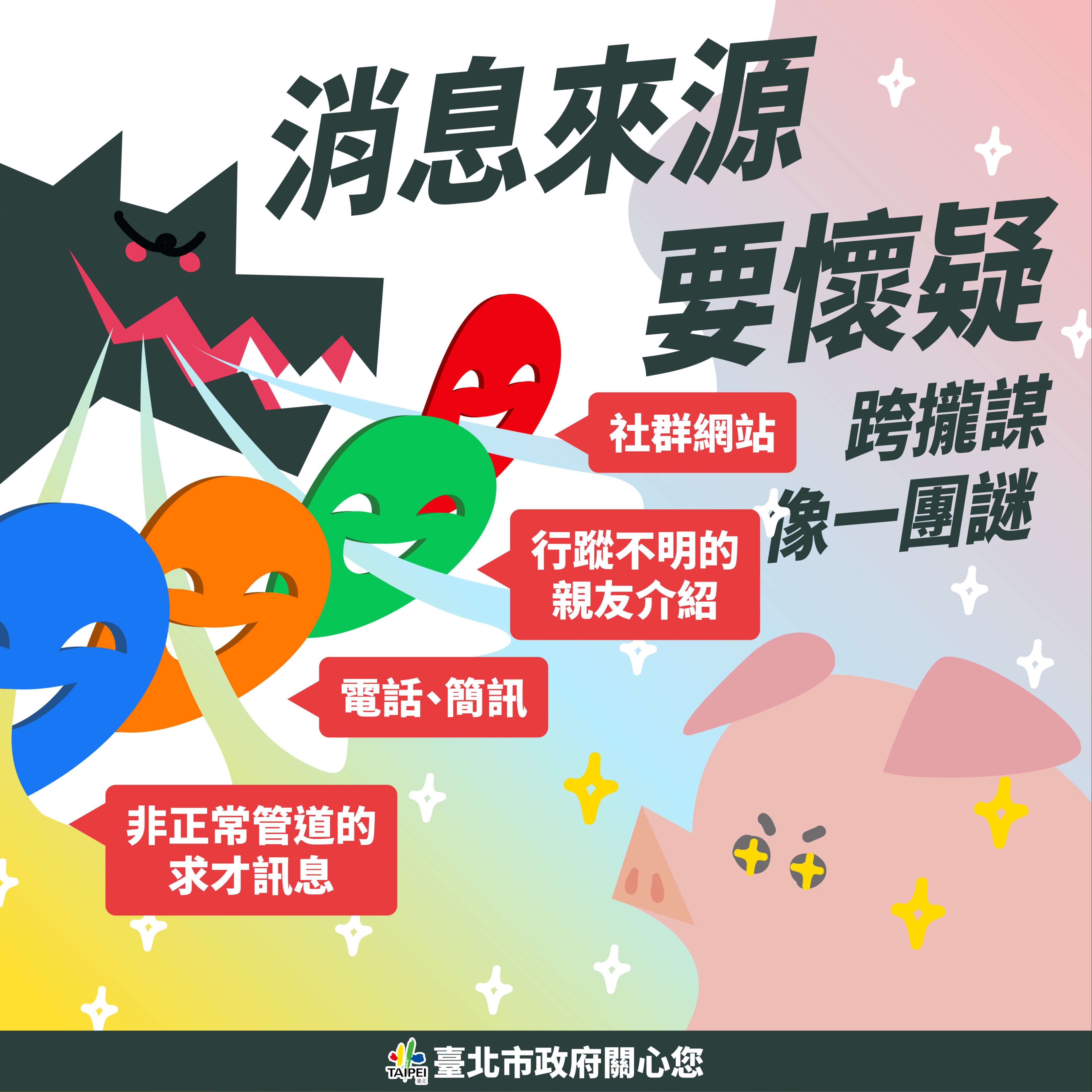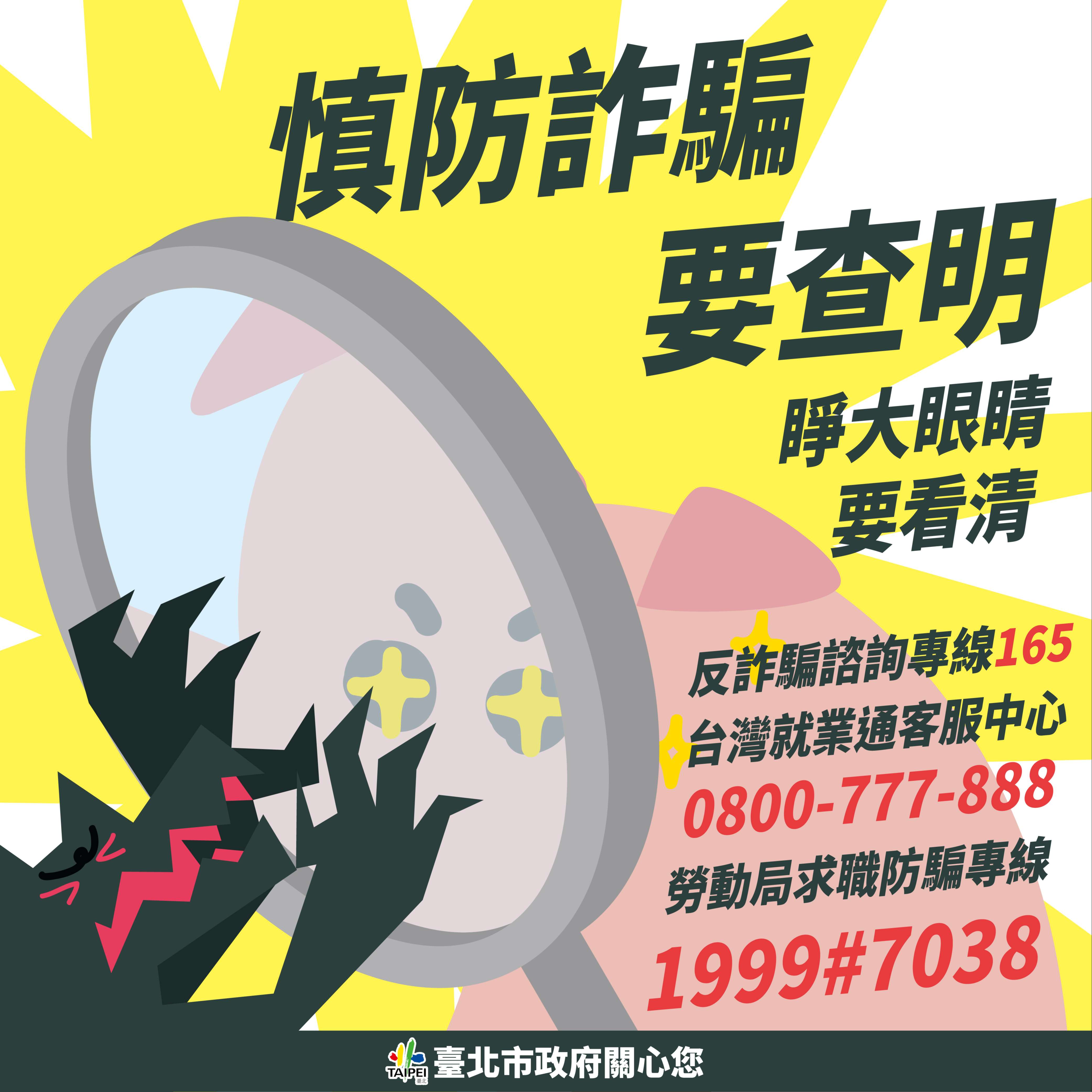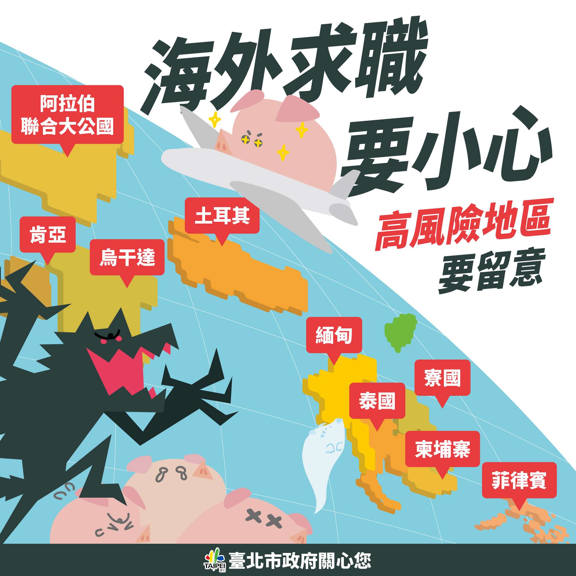 一、依據本府勞動局111年8月30日北市勞就字第1116102466號 函辦理。 二、近期海外求職詐騙事件頻傳,為加強市民自我保護意識, 請本局所屬各機關及學校協助公告並推播附件懶人包至所 屬媒體平臺(如:官方臉書粉絲專頁、IG、Line群組及電 子看板等),俾利提升民眾、學校師生及家長防詐知能。