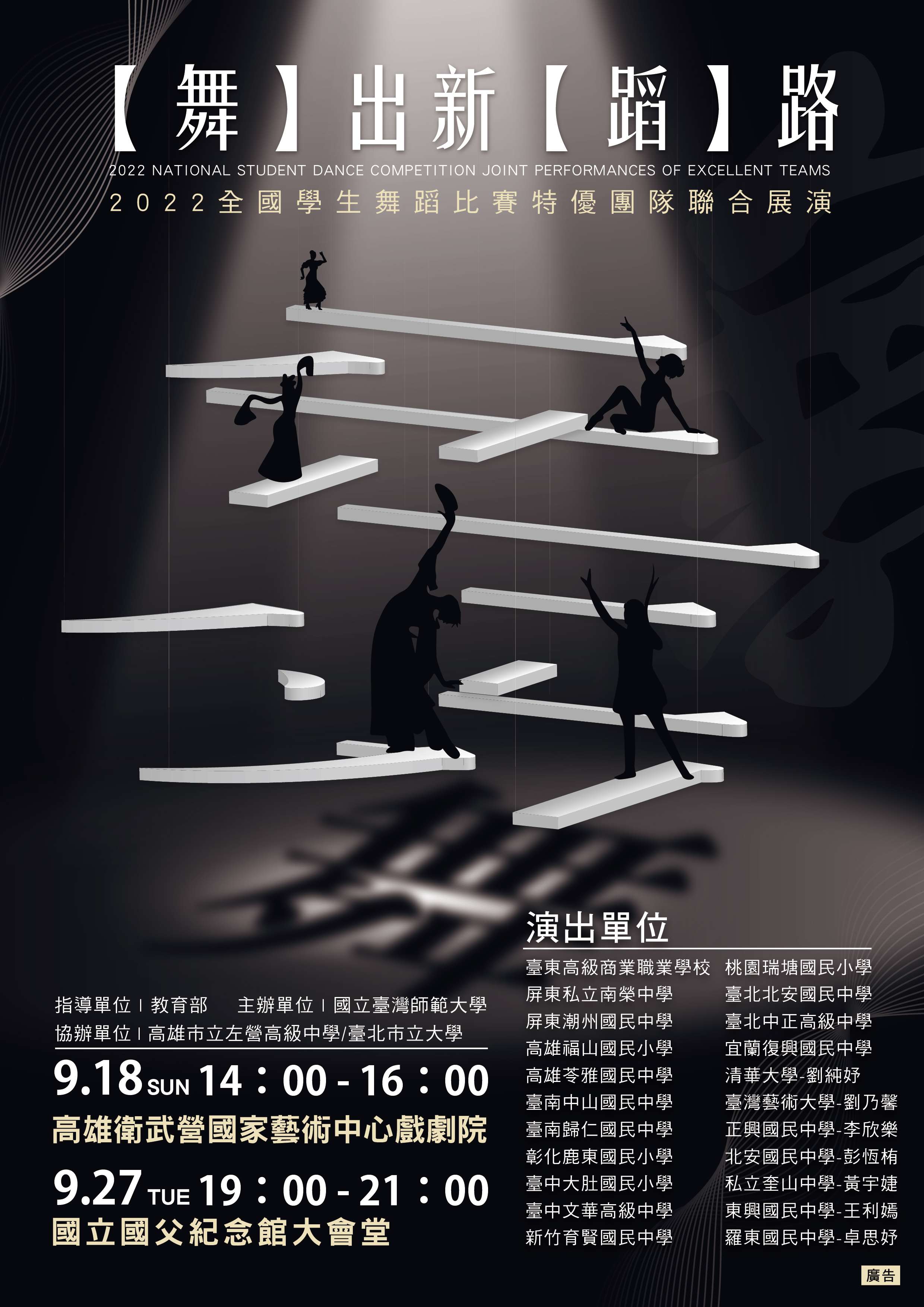 一、依據國立臺灣師範大學111年9月1日師大體研中字第 1111023884號函辦理。 二、教育部為提供成績優異隊伍演出之舞臺及交流觀摩之機 會,本年度特規劃辦理旨揭活動,擇優邀請111學年度全國 學生舞蹈比賽特優團隊或個人參與演出,希推廣校園舞蹈 教育。 三、旨案將於臺北及高雄兩地表演,臺北場相關訊息說明如下 (一)時間:111年9月27日(星期二)19時至21時30分。 (二)地點:國立國父紀念館大會堂。 (三)索票方式:自111年9月5日10時起至9月7日17時止,至指 定網址填寫需求(https://docs.google.com/forms/d/1N53KMFDJYvsYtxj0fwmGW3dCo6k44XSohEr_d1wRLpk /edit)。索票順序依序為參演單位、舞蹈相關單位、 110學年度參賽隊伍及一般觀眾。 四、檢附海報1份,請貴校協助宣傳周知相關人員踴躍索票。