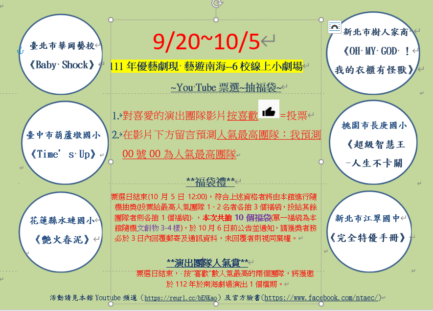 一、依據國立臺灣藝術教育館111年9月19日藝演字第 1110002981號函辦理。 二、111年度表演藝術類競賽因嚴重特殊傳染性肺炎無法現場聆 賞,國立臺灣藝術教育館(下稱藝教館)特地舉辦「優藝 劇現」創意戲劇比賽網路小劇場推廣活動,邀請創意戲劇 優秀團隊至該館南海劇場演出錄影,以網路播映方式,即 日起至111年10月5日止在藝教館官方臉書連結YouTube頻道 播出,歡迎民眾藉由線上平臺欣賞學生們創意優質戲劇。 三、旨揭活動同時辦理最佳影片票選及送福袋等活動,活動詳 情請逕至該館官方臉書網站(https://www.facebook.com/ntaec/)查詢。