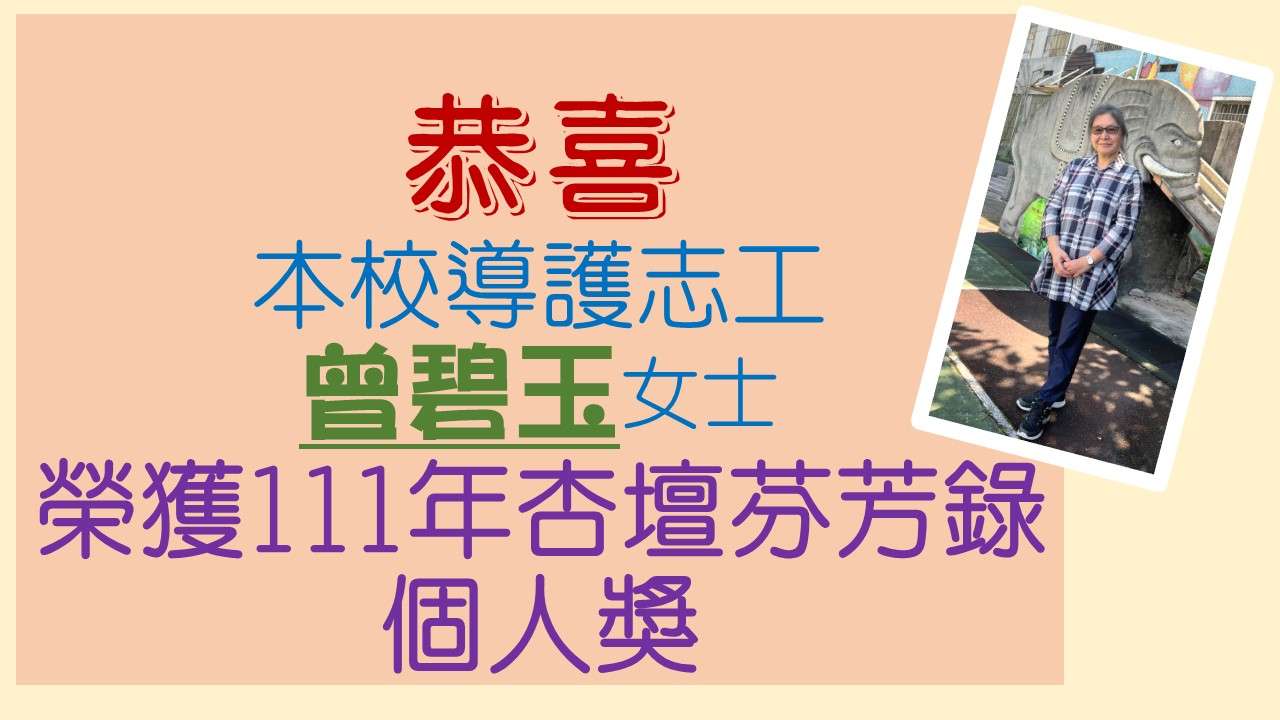 恭喜本校導護志工曾碧玉女士榮獲111年杏壇芬芳錄個人獎