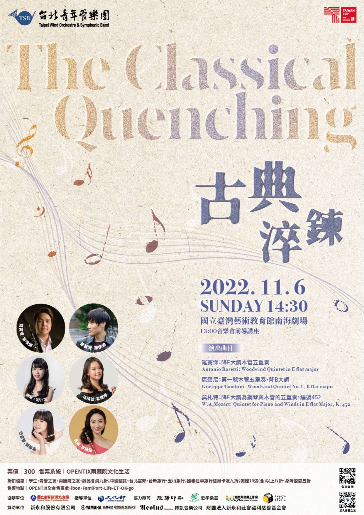 一、為使民眾了解古典時期音樂特色,本團特邀請國內優 秀木管與鋼琴新秀演奏家,精選多首古典時期優美曲目, 包含莫札特管樂與鋼琴五重奏及當代木管五重奏曲目。 二、旨揭音樂會相關訊息如下: (一)演出時間:111年11 月6日 (星期日)下午2:30 (二)演出地點:國立臺灣藝術 教育館南海劇場(臺北市中正區南海路47號)。 (三)購票 請至兩廳院購票系統 (https://0rz.tw/U3CZk);團體購票 (10人以上)可享8折優惠,請逕洽台北青管樂團經理王先生 (02-2322-3654)。 (四)相關音樂會資訊請至台北青年管樂 團臉書粉絲專頁查詢(https://www.facebook.com /tsbgroup/)。 三、檢附旨揭音樂會海報供參。