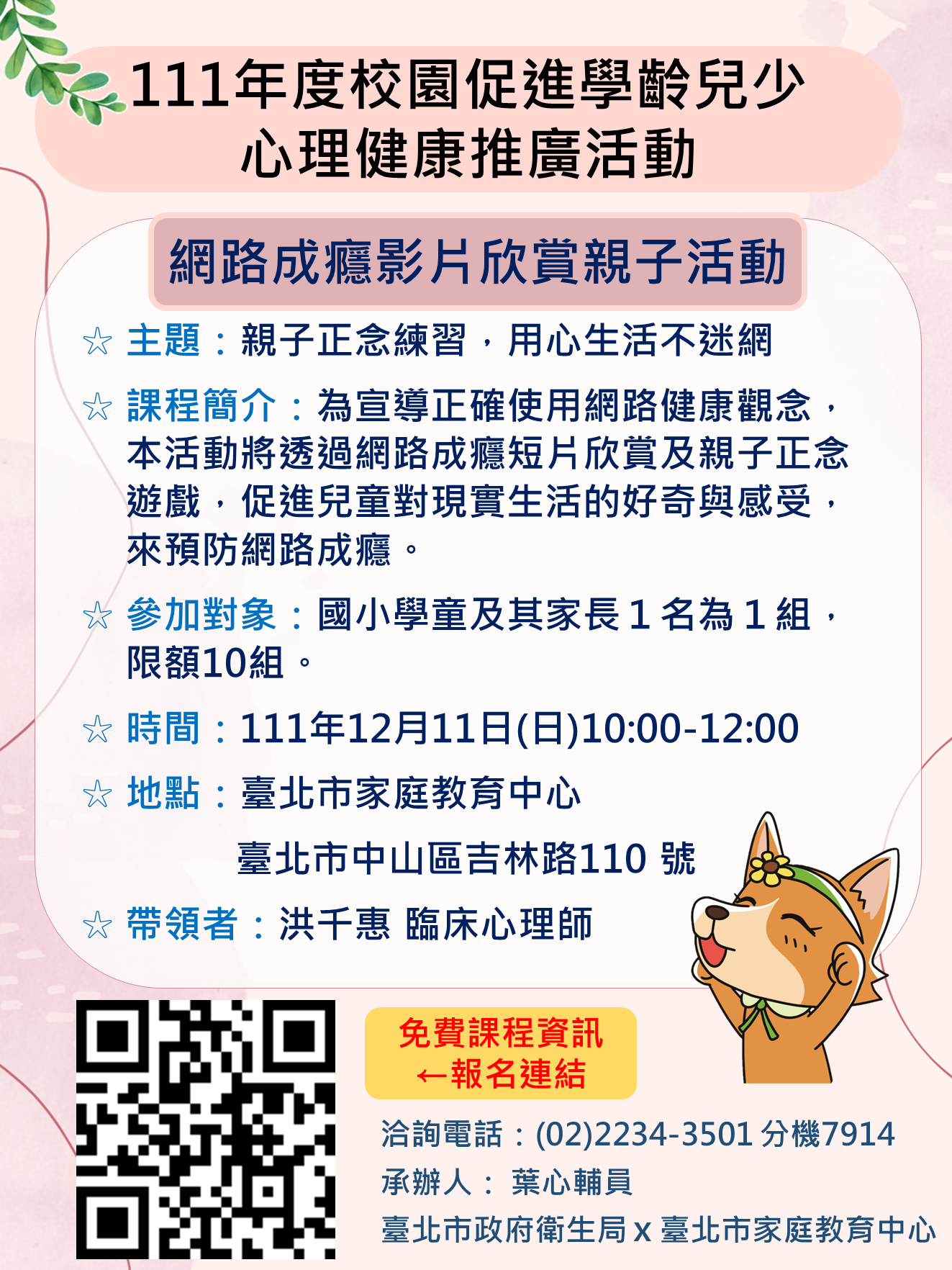 (五)報名網址:https://mental-health.gov.taipei/(臺北 市社區心理中心官網-報名專區-講座/活動)。