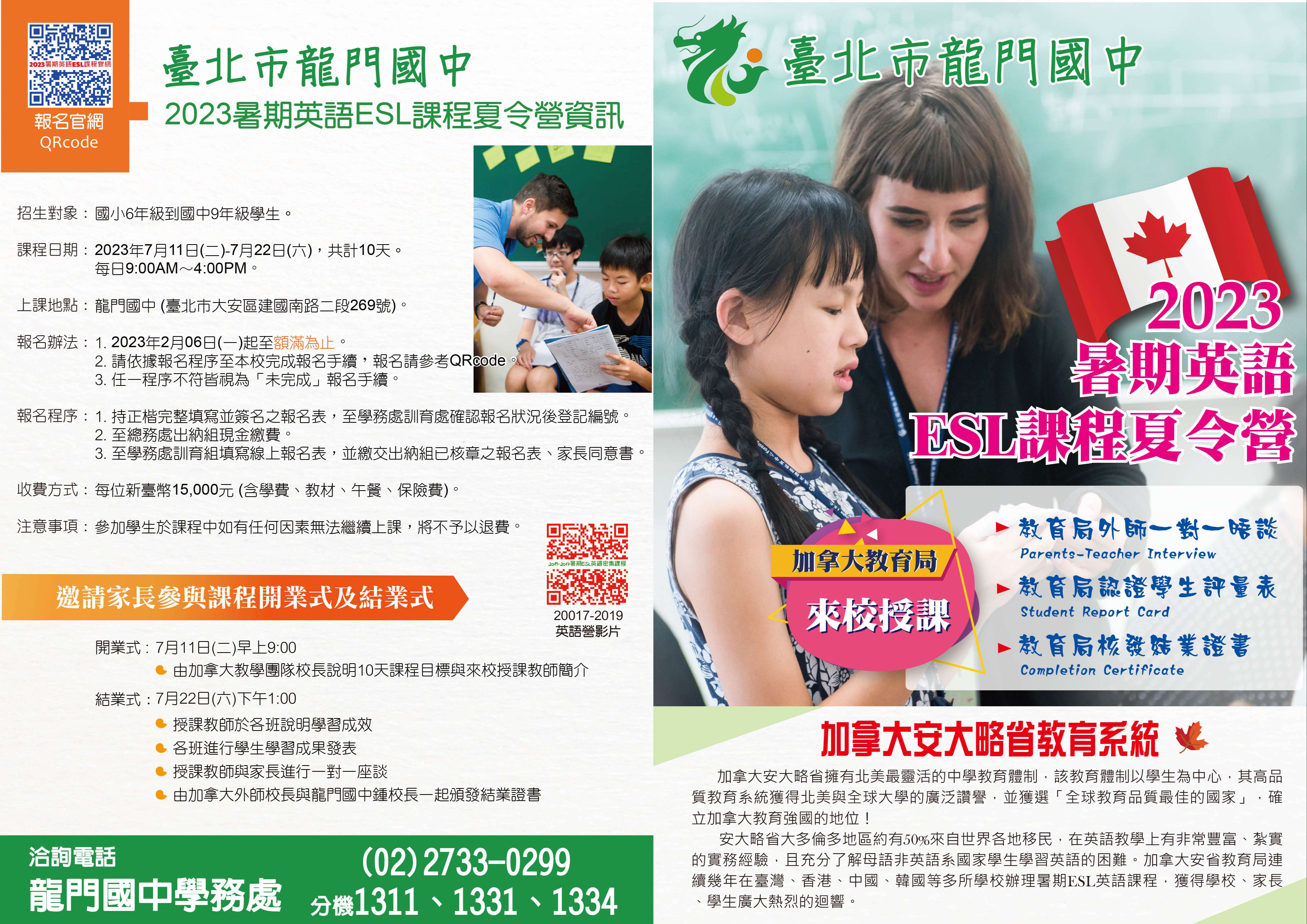 一、師資:加拿大多倫多萊姆頓肯特教育局現職公立合格5年以 上教師。 二、課程內容:主題式的實作英語課程、全英語實境學習環 境,每班僅收25人。(詳見實施計畫) 三、活動日期及時間:2023年7月11日(二)至7月14日(五)、7月 17日(一)至7月22日(六),為期10天,時間為每日09:00- 16:00,兩週課程共計60小時。 四、活動地點:臺北市立龍門國民中學。 五、錄取名額及截止日期:一般生招收100人、低收入戶學生招 收4人(需檢附相關正式證明文件),依報名順序錄取,額 滿為止。 六、報名費用:每位15,000元(含午餐),低收入戶學生4名僅收取1,000元(午餐費新臺幣800元及校內行政費200元)。 七、報名方式:報名期間為即日起至額滿為止(以完成報名手續 順序為準),有意報名參加之學生家長請於上班日08:30- 15:30(12:30-13:00午休)依下列步驟,至本校完成報名程 序。 八、課程資訊請至本校專屬網站查詢:http://210.243.35.7 /tblog/blog/59。