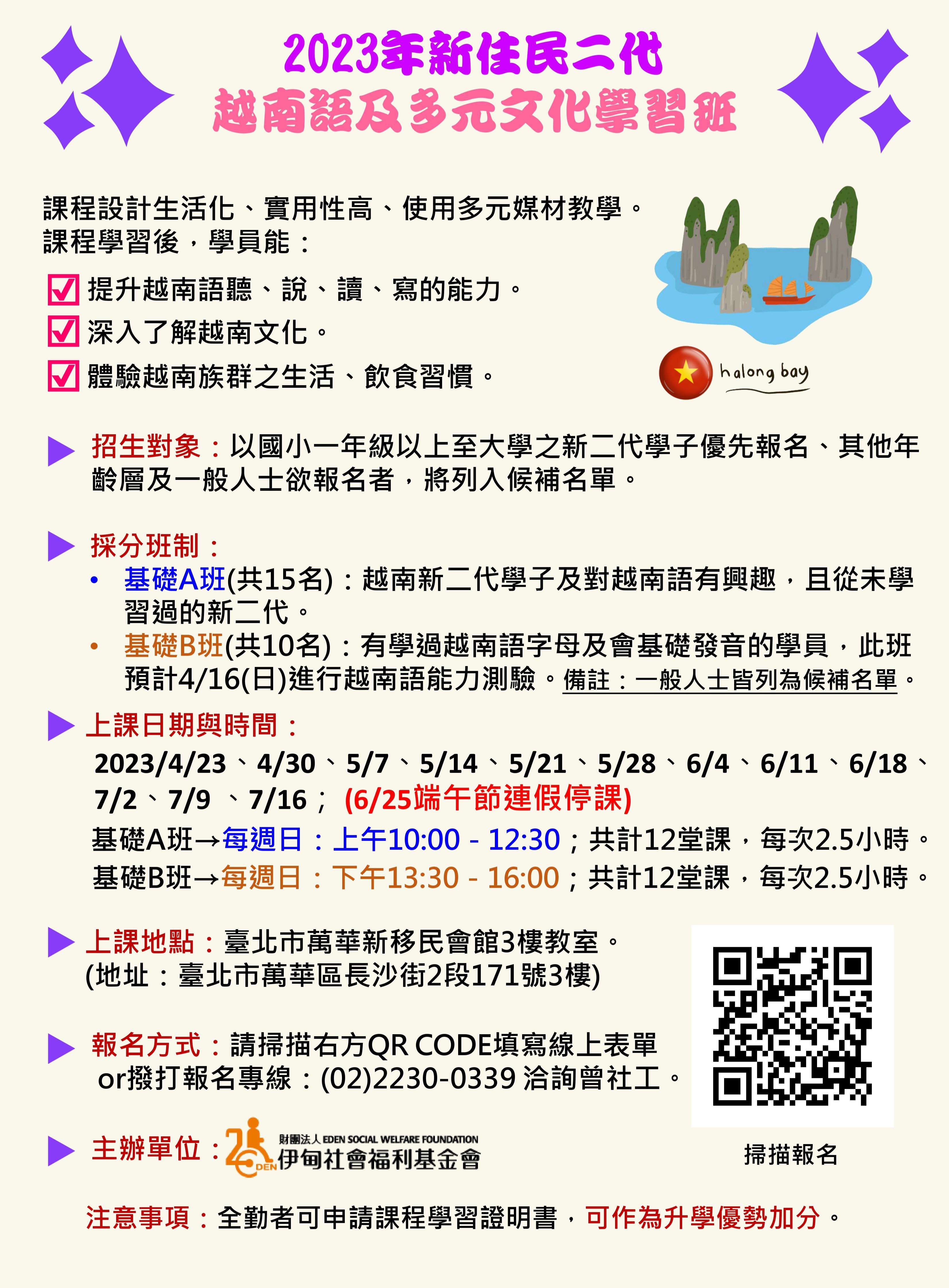 說明: 一、本會為提升新住民子女之優勢能力,自2010年起開始投入 新二代培力工作,每年透過多元文化、人際關係、兩性關 係、公益服務、團隊合作訓練、興趣探索等課程,加強新 二代多元智慧能力,以提升文化視野及競爭力,為增強新 二代的雙語能力之優勢及呼應政府大力推動新南向政策 下,將於112年4-7月辦理「112年度新二代越南語及多元文 化學習班」,透過多元文化學習提升新二代之國際視野, 儲備其未來競爭力。 二、「新二代越南語及多元文化學習班-基礎A班」辦理地點及 期程如下:112年4月23日至7月16日(6月25日端午節連假停 課),每週日上午10:00-12:30,共計12堂課;上課地點: 萬華新移民會館3樓研習教室(台北市萬華區長沙街二段171 號3樓),課程資訊詳如附件簡章。
