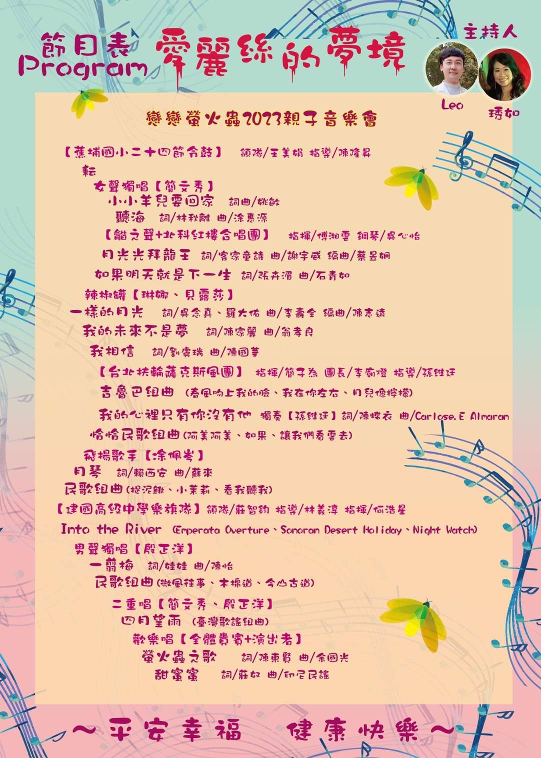 一、案係本處與財團法人億光文化基金會及財團法人大安森林 公園之友基金會訂於112年4月29日假大安森林公園露天音 樂台共同主辦旨揭活動。 二、本次音樂會將邀請聲樂家簡文秀教授、殷正洋、凃佩岑、 孫維廷、辣椒罐、台北扶輪薩克斯風團、建國高級中學樂 旗隊、蕉埔國小二十四節令鼓、龤之聲+北科紅樓合唱團等 團體共同演出,是為一場親子同歡的音樂會 。 三、邀請貴校與本處共同宣傳音樂會廣為周知並協助刊登活動 資訊於所屬宣傳管道(包含跑馬燈),文字稿參考內容、 活動海報及節目表如附件。