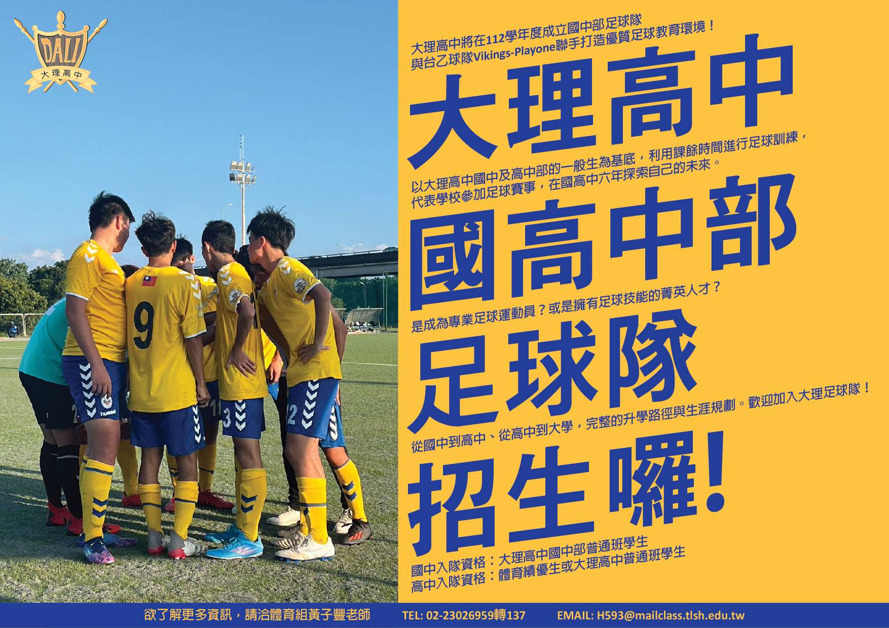 二、足球隊為普通班學生,學籍需設在大理高中國中部學區內方可入學。