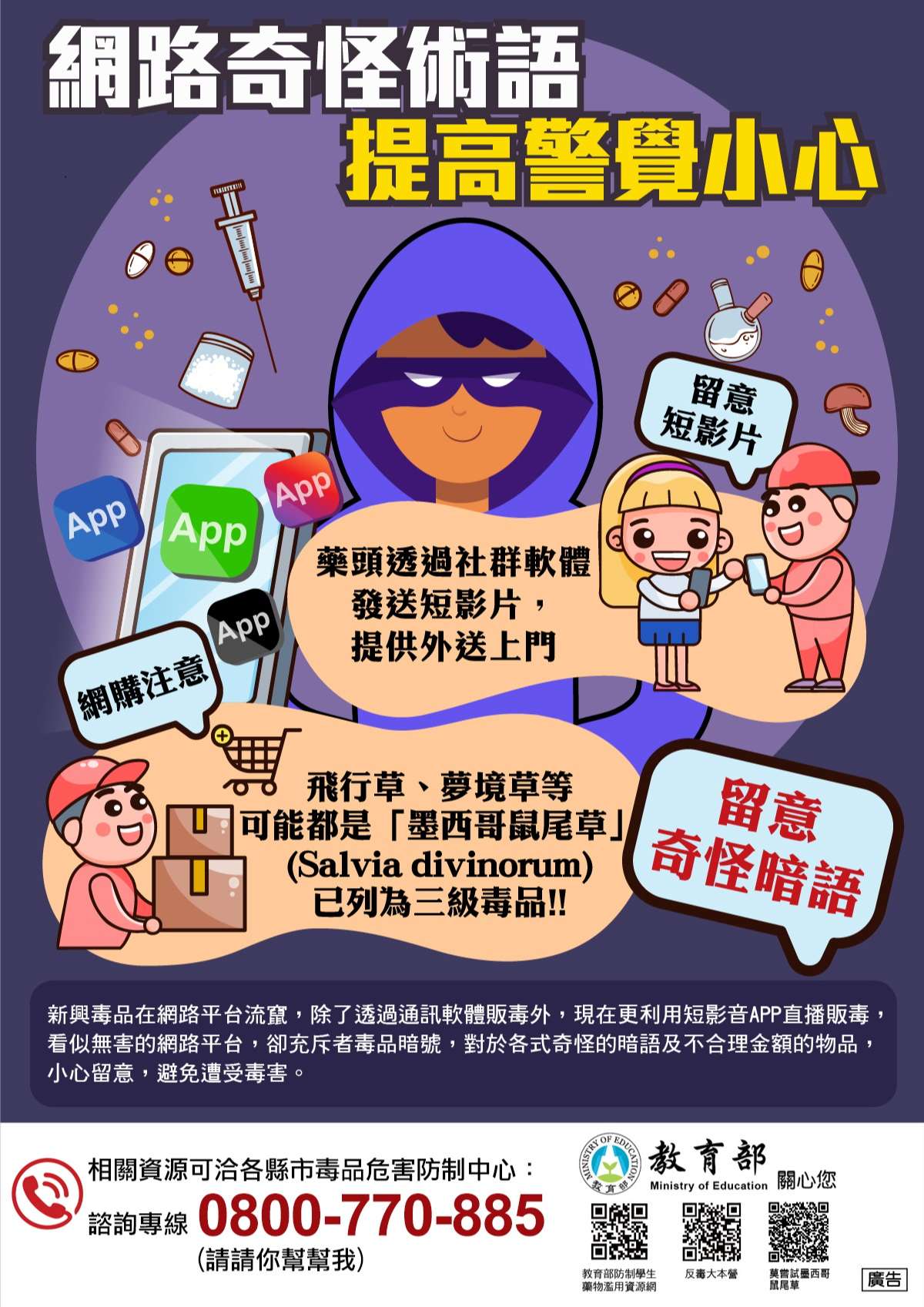 一、依教育部112年5月9日臺教學(五)字第1122802130號函辦 理。 二、為落實新世代反毒策略,並提升校園「防制學生網路涉毒 與販毒」議題的關注與宣傳,教育部規劃多元宣導方式說 明如下: (一)「破解網路涉毒危機」實體、電子海報及「網路奇怪術 語提高警覺小心」電子海報: 1、實體海報另以聯絡箱交換至各校,請於暑假前完成張 貼。 2、2款海報電子檔及2種尺寸Banner(1173X657) (570X160)已掛載教育部防制學生藥物濫用資源網文 宣專區(網址:https://enc.moe.edu.tw/)供大眾下 載使用。3、請各校於相關研習、活動、會議等適當場合宣導,並 運用網路各式平台(粉專、IG、官網等)加強宣導或 透過電子看板播放。 (二)跑馬燈宣傳文字:請各校於112年6月至8月間之適當時 間,透過跑馬燈字幕機或無聲廣播系統以文字輪播(文 字內容同步刊登於教育部防制藥物濫用資源網最新消 息)。 三、前揭相關宣導事項可於112年6月間,結合國際反毒日辦 理,並於開學友善校園週列入宣導項目。