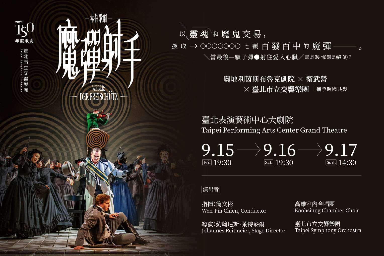 一、依據臺北市立交響樂團112年6月26日北市樂研字第 11230021343號函辦理。 二、臺北市立交響樂團年度歌劇演出謹訂於本(112)年9月15- 17日(五-日)假臺北表演藝術中心大劇院演出,帶來浪 漫派作曲家韋伯的歌劇《魔彈射手》,由臺北市立交響樂 團與奧地利茵斯布魯克劇院、衛武營國家藝術文化中心跨 國攜手合作製作演出,將於臺北及高雄兩地盛大登場! 三、旨揭節目將於6月20日(二)12:00全面啟售,7月4日 (二)12:00前購票可享早鳥7折優惠(最低票價不予折 扣),請逕至「OPENTIX兩廳院文化生活」網站或App購 票。 四、觀賞該節目另可登錄公務人員終身學習認證課程時數3小 時,請於演出現場服務臺登記。五、相關節目資訊如下: (一)節目名稱:【2023 TSO年度歌劇】韋伯歌劇《魔彈射 手》 (二)演出場次: 1、112年9月15日(五)19:30。 2、112年9月16日(六)19:30。 3、112年9月17日(日)14:30。 (三)地點:臺北表演藝術中心大劇院(臺北市士林區劍潭路 1 號) (四)購票連結:https://www.opentix.life/event /1669653481418141697。 (五)演出簡介: 1、德國作曲家韋伯(Carl Maria von Weber,1786- 1826)歌劇「魔彈射手」,為浪漫派歌劇經典代表, 劇情融合童話故事與民間傳說,創造狼谷獨特陰森氣 氛,並運用劇場語言呈現超自然力量與神祕離奇。 2、本次邀請奧地利茵斯布魯克歌劇院的新穎製作,強調 心理縱深,對白改用作曲家白遼士(Hector Berlioz,1803-1869)寫的演唱版,更具歌劇特色。 森林和魔法,現實與奇幻,優美曲調加上刺激造景, 具戲劇性張力,適合闔家觀賞。