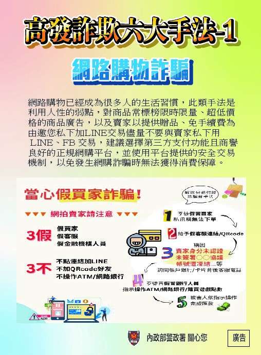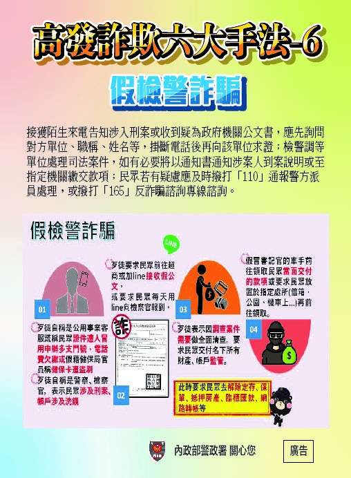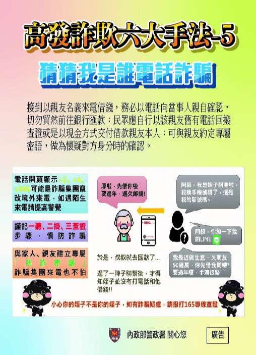 一、依據本府警察局112年6月29日北市警刑經字第1123039646 號函辦理。 二、本案影片檔總計10部,Google雲端連結9部,youtube連結1 部(如附件1),宣導圖文6張(如附件2至7),推播期程 為1個月(可視各機關單位規定自行安排調整),請共同響 應推廣,運用各式宣導管道推播行銷,提升國人防詐免疫 力。