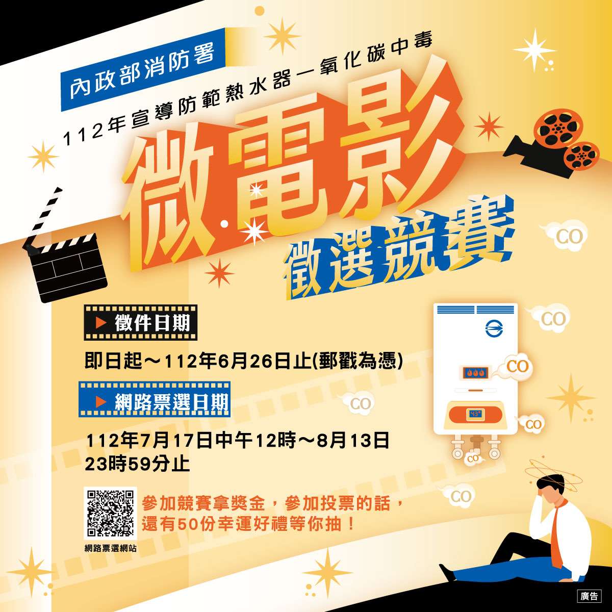 一、依據本府消防局112年7月18日北市消預字第1123028603號 函辦理。 二、檢附宣傳圖卡1份,參與投票者可參加抽獎活動。(詳活動 官網:https://www.nfa-comicromovie.com.tw/)