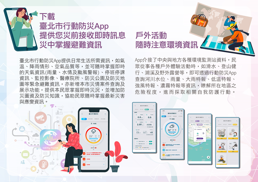 臺北市行動防災App已完成更版上架作業,本次改版採用極簡風格搭配明亮乾淨的配色,及直覺化、友善化、視覺化、客製化及生活化的設計原則,並導入英文介面選項,全新功能提供市民下載使用。
