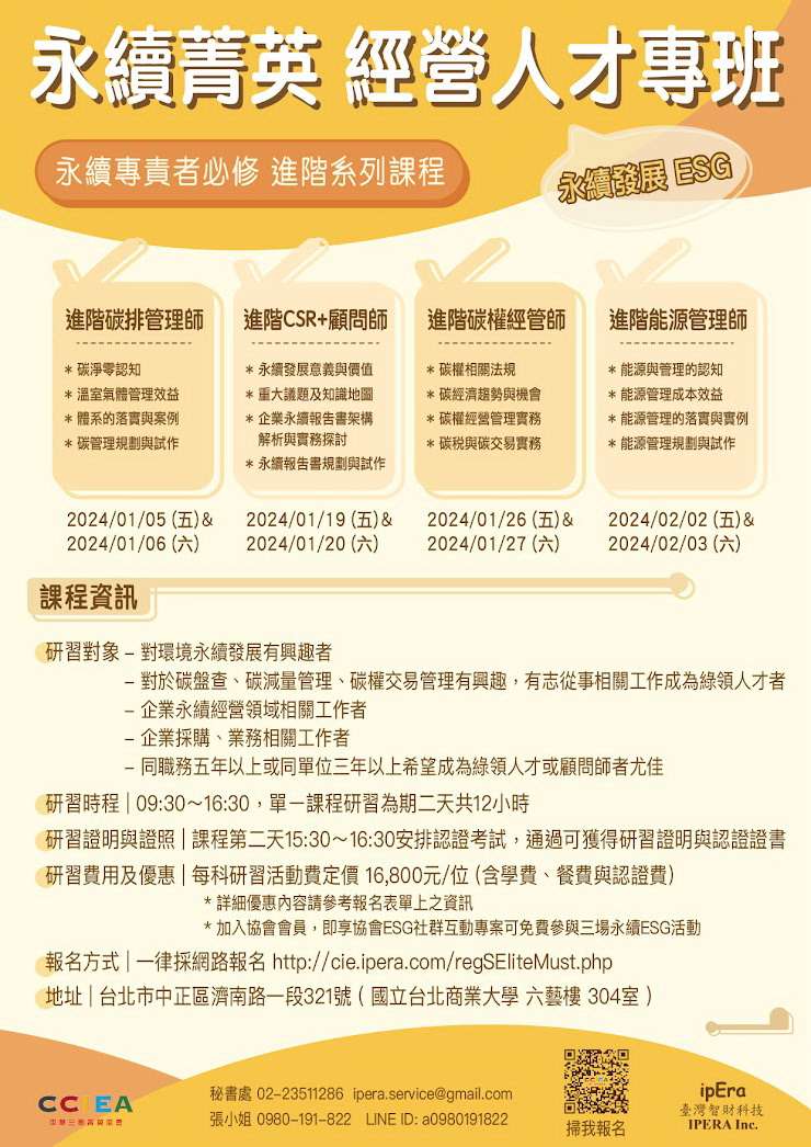 二、、課程日期:1.進階碳排管理師培訓:2024/1/5(五) & 1/6 (六) (掌握碳盤查與碳足跡ISO14064&14067實務)2.進階 CSR+顧問師培訓:2024/1/19(五) & 1/20(六)(掌握永續報 告CSR實務)3.進階碳權經管師培訓:2024/1/26(五) & 1/27 (六)(掌握碳權稅CBAM&CCA實務)4.進階能源管理師培訓: 2024/2/2(五) & 2/3(六)(掌握能源管理系統ISO50001實 務)