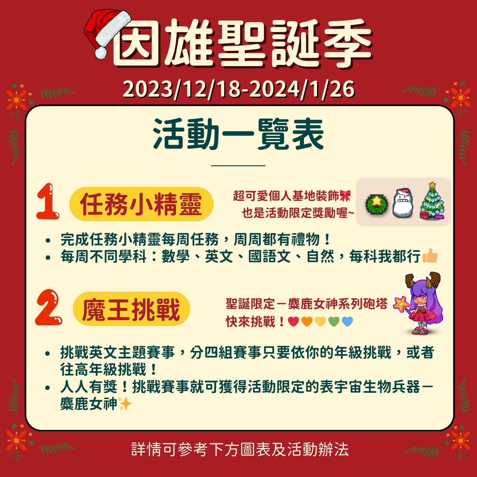 二、旨揭活動於112年12月18日(星期一)起至113年1月26日 (星期五)止,每日7時至22時,歡迎全國師生踴躍參加。詳細活動內容請參閱官網(https://adl.edu.tw/hero/)及臉書粉絲專頁(https://www.facebook.com/heroj7.tn)。
