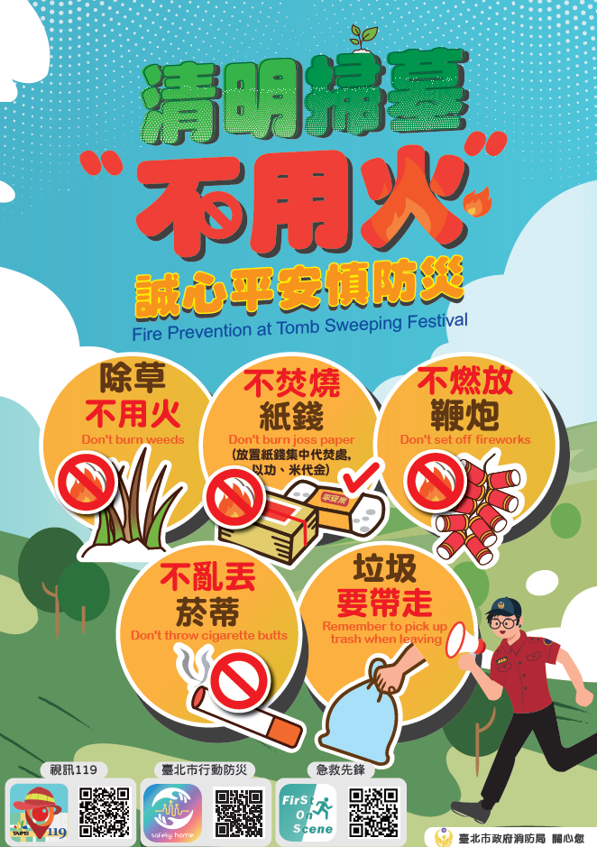 「除草不用火」、「不焚燒紙錢」、「不燃放鞭炮」、「不亂丟菸蒂」及「垃圾要帶走」等做為防災宣導之主軸,期以民眾掃墓不用火源為目標,有效減少林野火災之發生,並宣導民眾下載防災相關APP,提升災害預警意識及臨災應變能力。
