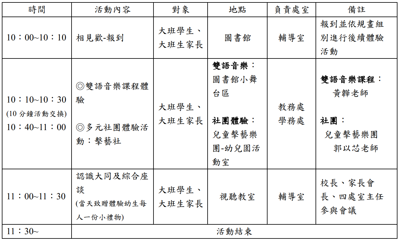 恭喜您的寶貝長大了,即將進入小學階段,這是另一種與幼兒園完全不同的學習歷程,因此我們特別舉辦新生體驗活動,分享幼小銜接的經驗,讓孩子體驗國小社團活動及大同國小實施的雙語課程教學等,來幫助家長和孩子提早熟悉小學環境與作息,未來才能更盡快適應小學生活。
