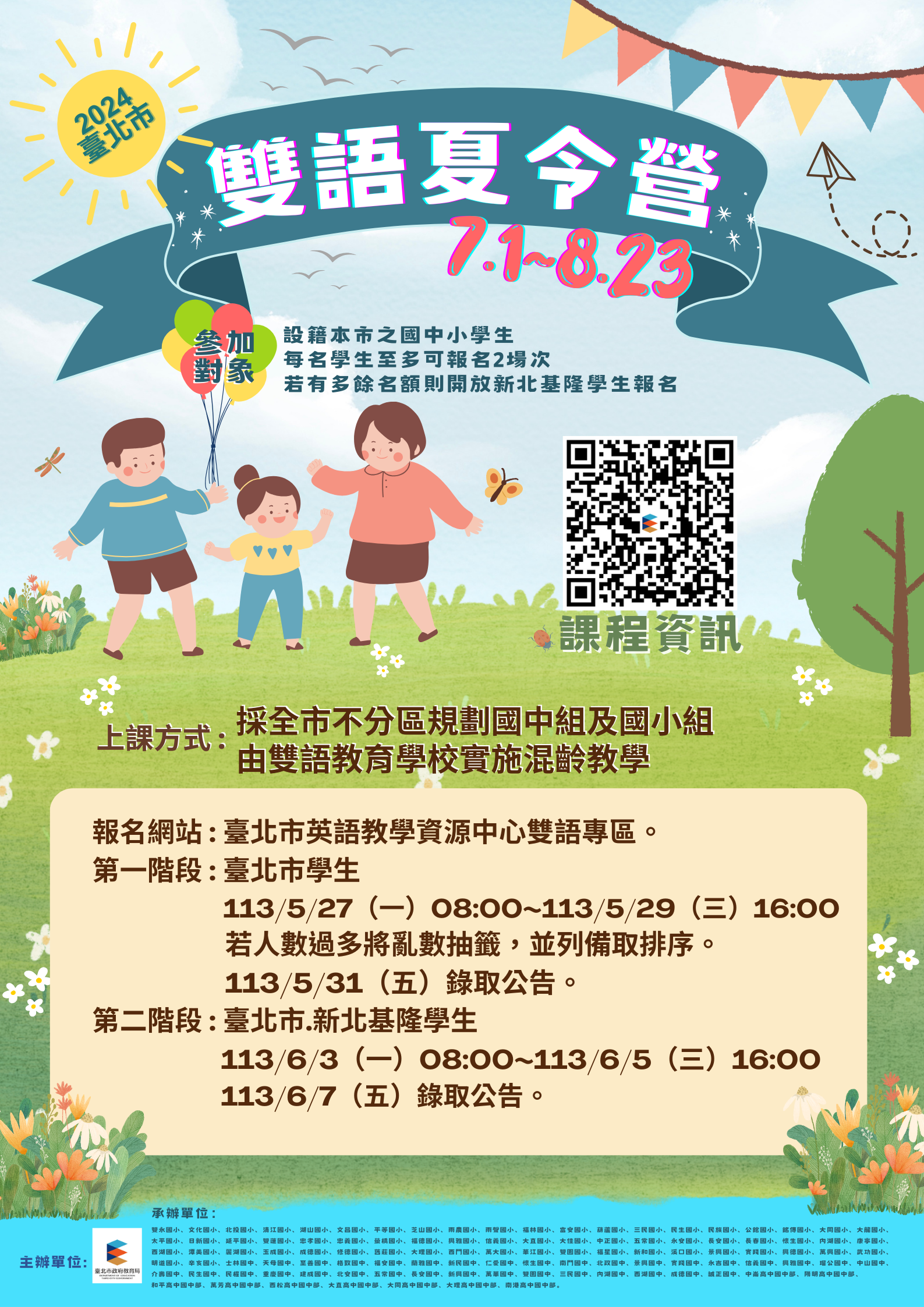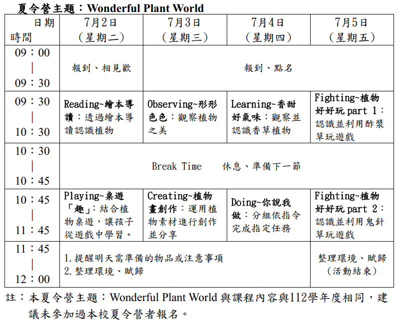 臺北市雙語夏令營,本校共開設1梯次,時間及內容如下: