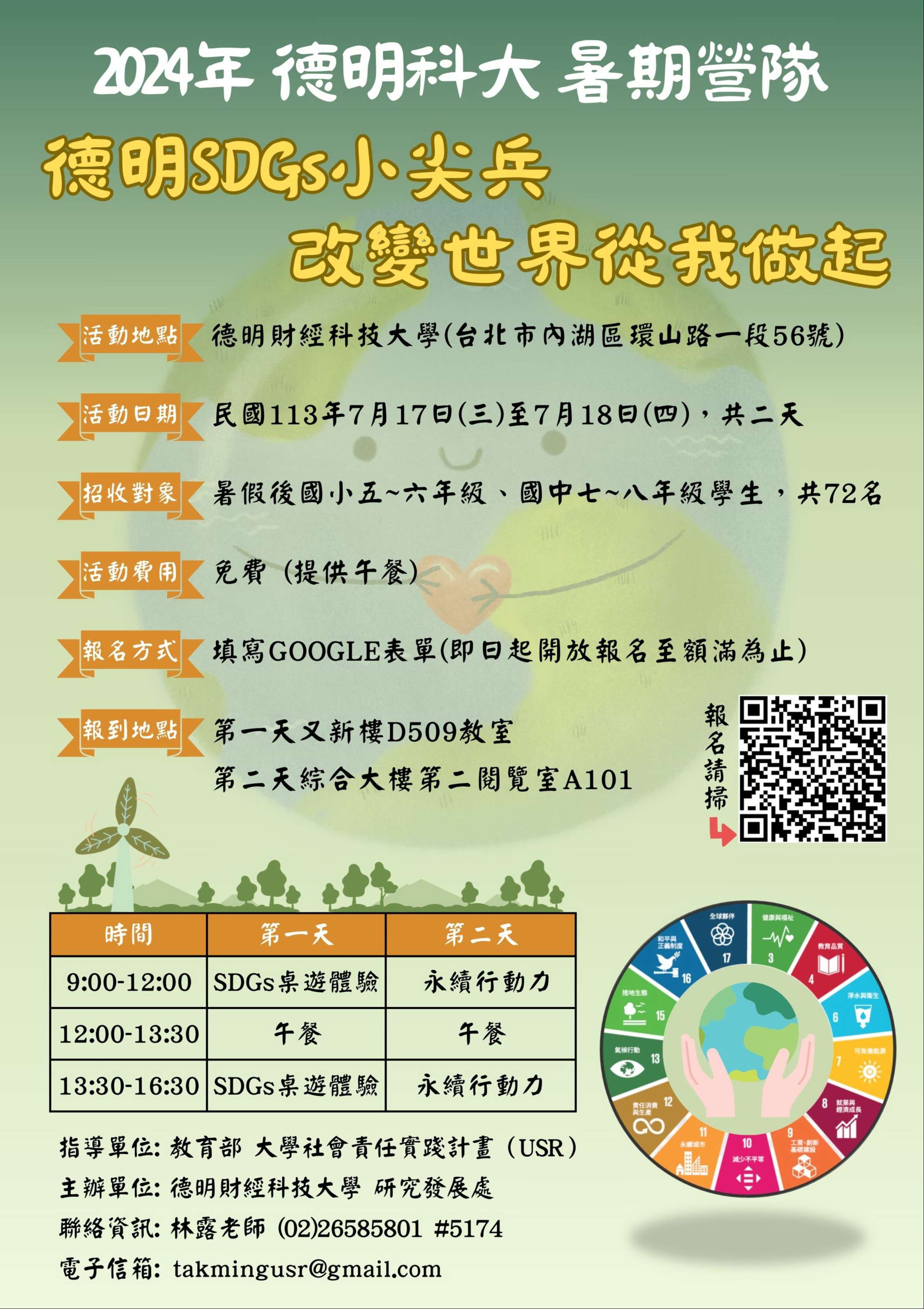 二、為執行教育部第三期(112-113年)大學社會責任(USR) 計畫,推動國中小生永續教育,期以輕鬆有趣的方式啟發 孩子們對永續發展目標(SDGs)的認識和行動,通過SDGs 桌上遊戲體驗與永續行動力啟發活動,激發學員在日常生 活中實踐SDGs目標,並成為永續行動的推動者。